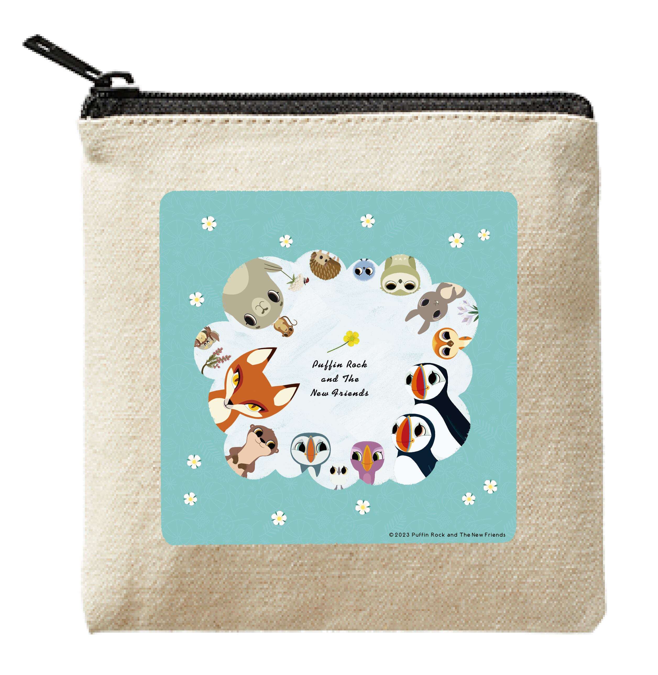 登場キャラクターたちが円形にデザインされたかわいいポーチです。ライトキャンバス、素材色ナチュラル。フルカラーDTF転写。13cmX13cm。